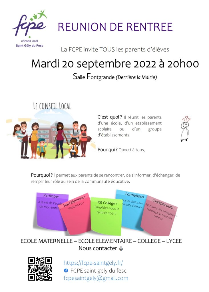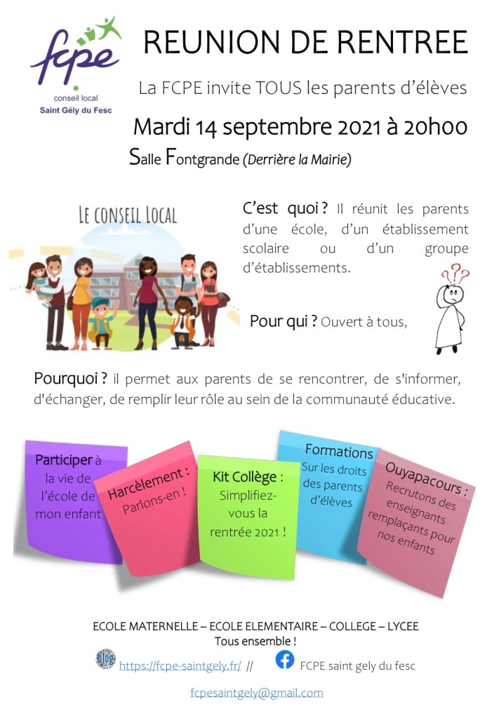 La prochaine AG du conseil local de la FCPE Saint Gely du Fesc (écoles primaires et collège) aura lieu :le mardi 19 octobre à 20h00 dans la salle Fontgrande (derrière la mairie)